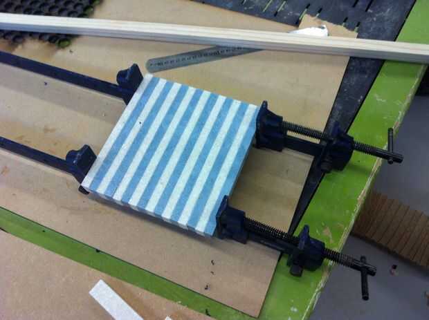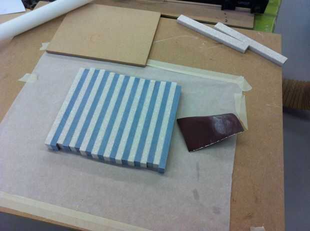 Después de que las tiras se cortan, tienen laminado juntos. Cada lado debe ser afinado con lija de grano 80 para que la resina de epoxy se enlaza correctamente a cada pieza de Corian. Alinear las tiras, alternadas los colores mientras que la adición de resina a cada lado, luego fije una a otra.