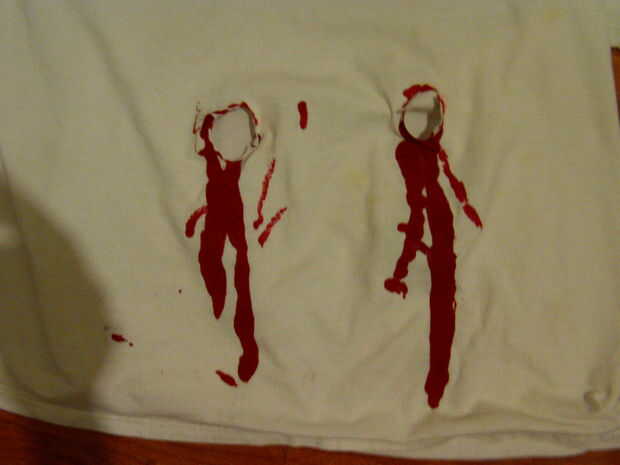 4. Aplique el pulimento de clavo de dedo rojo brillante alrededor de los orificios que cortar en la camiseta y luego verter el esmalte rojo por la parte delantera de la camiseta debajo de cada uno de los agujeros de la camiseta.  Deje que el esmalte se seque.