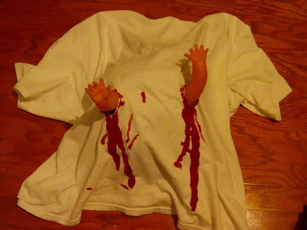 para este disfraz necesitas:1 camiseta1 muñeca pequeñasangre falsa 1 tubo1 calabaza pequeñaCorte 2 agujeros en la camisa de los brazos del bebé... Mantenga los orificios pequeños para que tenga que forzar el brazo a través de.Tire los brazos a través