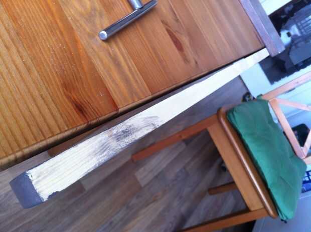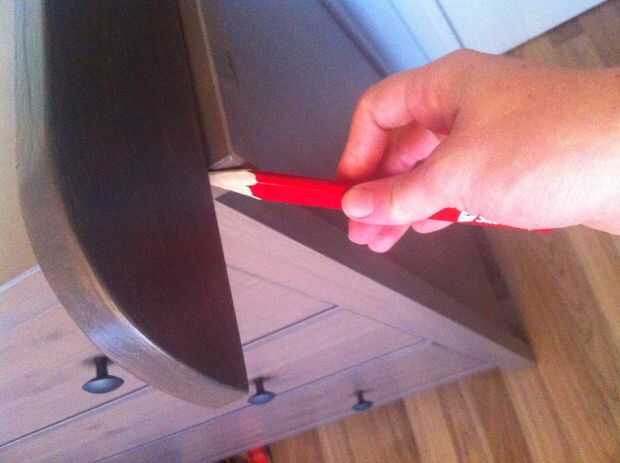 Imágenes 3 y 4: antes de ejecutar el paso 10 de este manual, puse el resultado preliminar sobre los cajones y dibujó una línea en la parte inferior para asegurarse de que mi tablón final se alinea perfectamente con el tablón superior de los cajones.