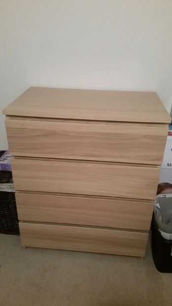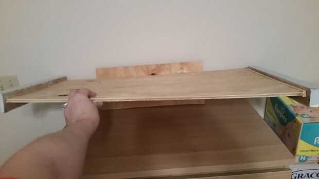 Corte los rieles laterales a la profundidad del pecho para que se alinee cuando visto desde el lado. El riel posterior, utiliza un trozo de madera contrachapada de 1/2" para reducir al mínimo la distancia de la pared y también le dio una significativa caída tras el pecho (aproximadamente 6 pulg.). Determiné que no necesitaba un riel frontal porque no deslizarse la parte superior con dos lados y el respaldo atrapada contra la pared.