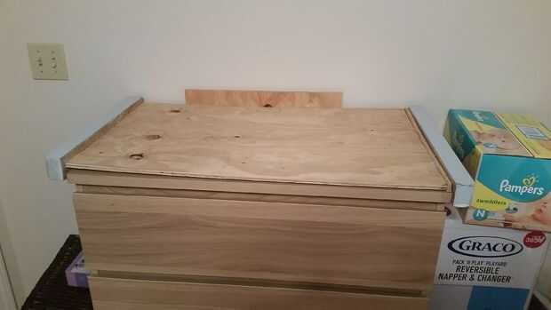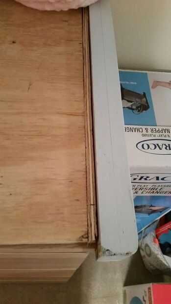Corté la parte superior de madera contrachapada plana las mismas dimensiones que la parte superior del pecho. Para atornillar los lados y también así derrames/líos iría en la parte superior y sería algún tipo de protección para la parte superior del pecho. Accidentalmente corte 1/2" corto por un lado y resolvió esto cortando una tira adicional de 1/2" y atornillándolo en el lado.