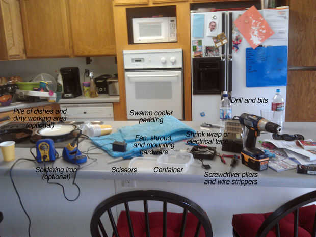 * Taladro y brocas - como mínimo tienes una bastante grande y en el rango de 11/64 (si se usa un ventilador similar). Si usted está careciendo un taladro y brocas que usted podría obtener con un instrumento de corte preciso y un punzón de las clases.