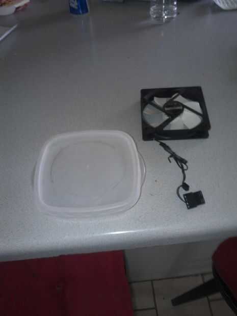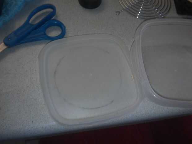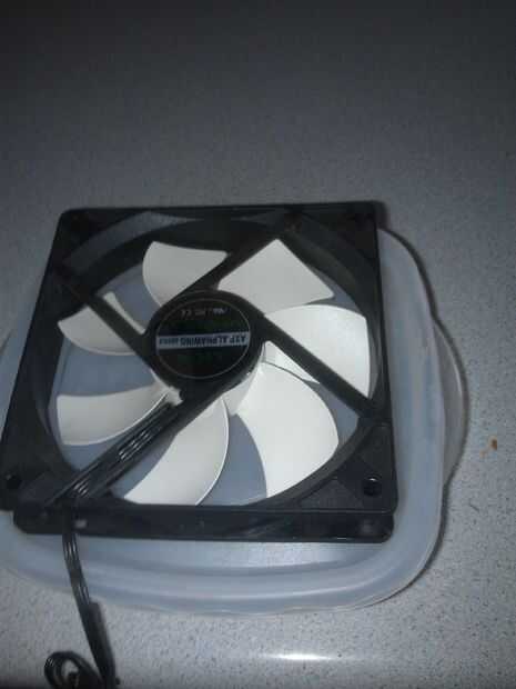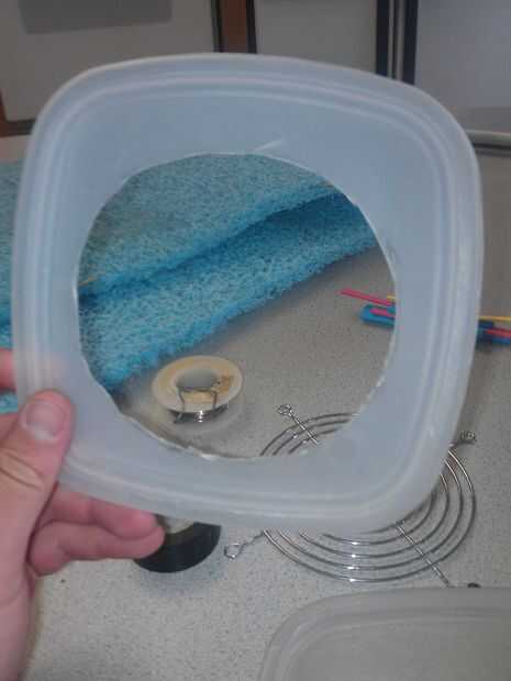 Desea que esta sea aproximadamente del tamaño de las aspas del ventilador. Coloqué mi ventilador en la tapa y trazada por el interior con un lápiz. Para el corte algo habría utilizado un cuchillo del tipo exacto, pero como siempre, la mitad de mis herramientas son exactamente donde dejaron y no tengo ni idea donde es, por lo tanto he utilizado tijeras. Probablemente se desea centrar el ventilador tanto como sea posible, como se puede ver mi orificio no era centro, pero resulta que, estaba un poco desequilibrado, de modo que se convirtió centrado bastante un poco más antes de montar para arriba.