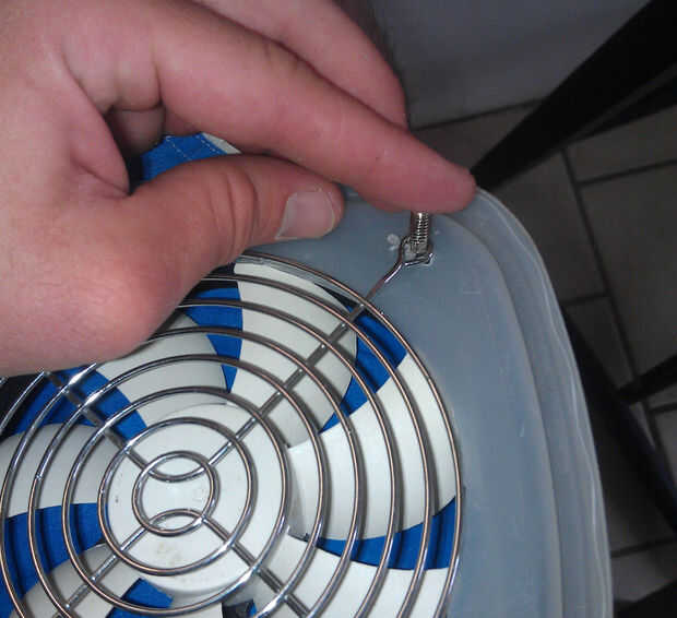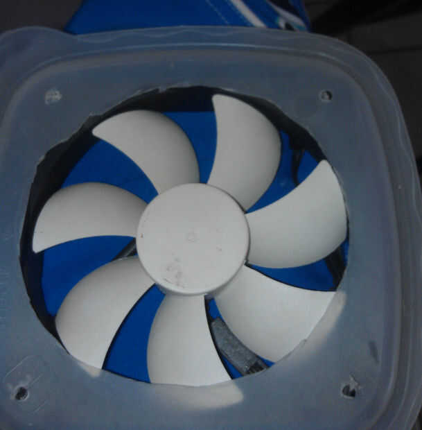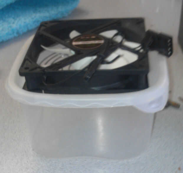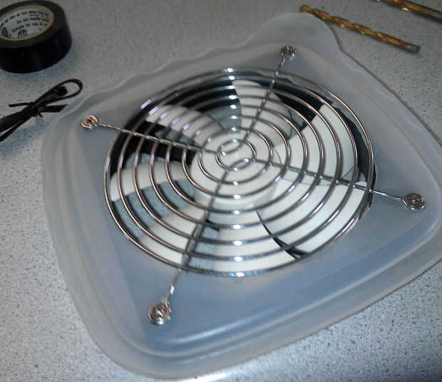 Esta parte era en realidad una de las partes más difíciles del proyecto. La fragilidad de la tapa hace difícil alinearse con los agujeros de la tapa, cubierta y ventilador. Como se puede ver, ventiladores para ordenador tienen la dirección de la etiqueta, el flujo de aire que es una conveniencia. Mayoría de los aficionados en la polaridad correcta va a empujar el aire hacia el exterior, puede que necesite experimentar con esto. Necesita el ventilador para ser jalando aire por el contenedor, esto va para las almohadillas húmedas. Me imagino todavía funcionaría en la dirección contraria, pero mis pensamientos eran, que elaborar el aire a través del contenedor ayudaría a extracción de humedad en las almohadillas. No dude en experimentar.