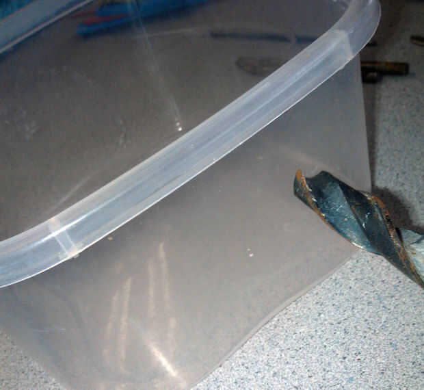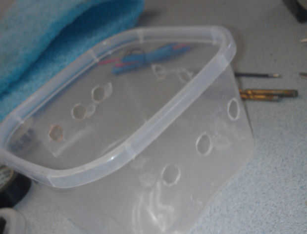 Para este paso, trate de pensar sobre el flujo de aire a través de su contenedor, así como el gran depósito que desee. Decidí hacer 3 agujeros en cada lado más o menos en medio de la profundidad del contenedor, de todo nivel con los demás (dar o tomar). El propósito de este paso es el más flujo de aire, sin comprometer la estructura de su contenedor. Como se puede ver, la parte inferior de mi contenedor de cambiado, craqueada a una inicial durante la perforación. Te desea utilizar una velocidad alta y trate de no forzar la broca a través de él. Si no usando un taladro, una dremel sería lo ideal, pero me imagino podría utilizar una navaja o probablemente incluso tijeras.