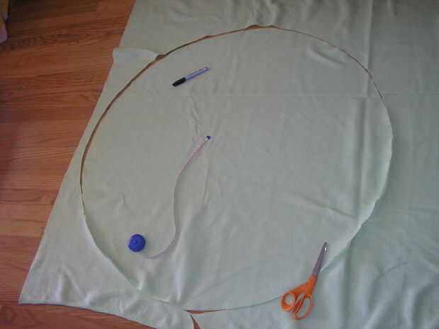 A continuación, trace un círculo en su material mediante la cinta métrica o una cadena para el radio, uno de los extremos de la cinta en el medio de anclaje marcado todo, y cortando el círculo. Lo mismo para el material de revestimiento si usted está usando.