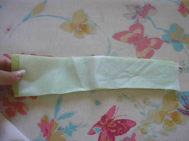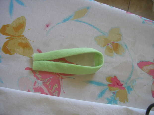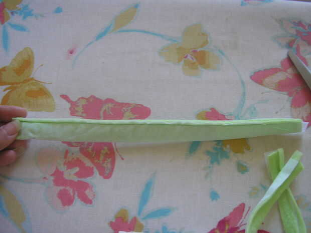 Tomar una tira de material exterior de 9" de largo y de fusibles conexión a él. Doblar por la mitad longitudinalmente y coser a lo largo del lado largo haciendo un tubo largo. Gire a la derecha hacia fuera y presione.