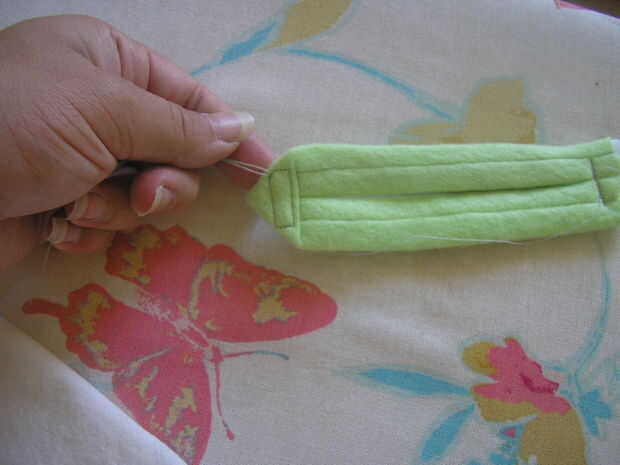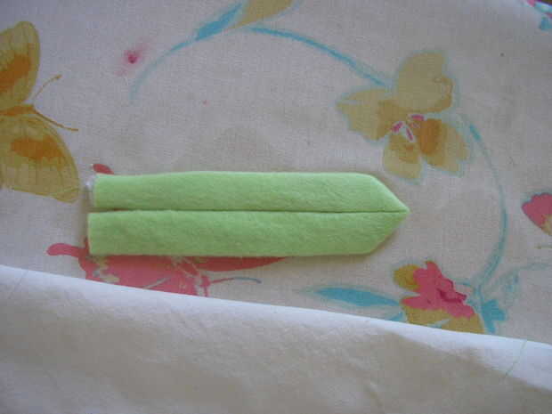 Doblar por la mitad como en el cuadro 4. Prensa plana, hacer una ficha con una flecha el punto al final. Puntadas en un extremo, y para mantener la flecha punto puntada un rectángulo como se muestra en la imagen.