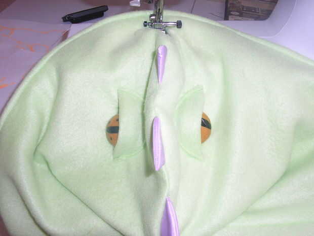 Gire a la derecha hacia fuera, presione. Pespuntear todo el cabo, teniendo cuidado de coser el agujero izquierdo para dar vuelta. Pespuntear una línea a cada lado de la costura central.