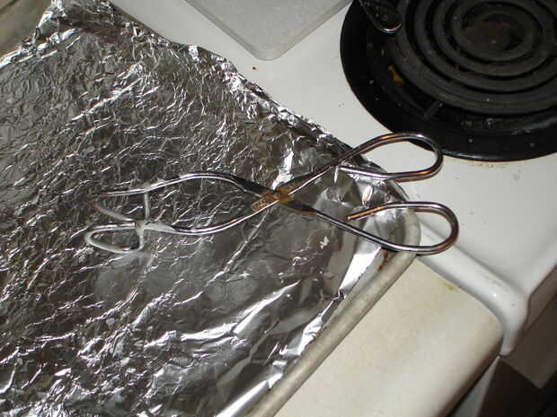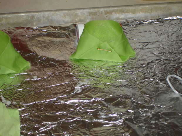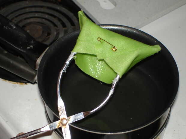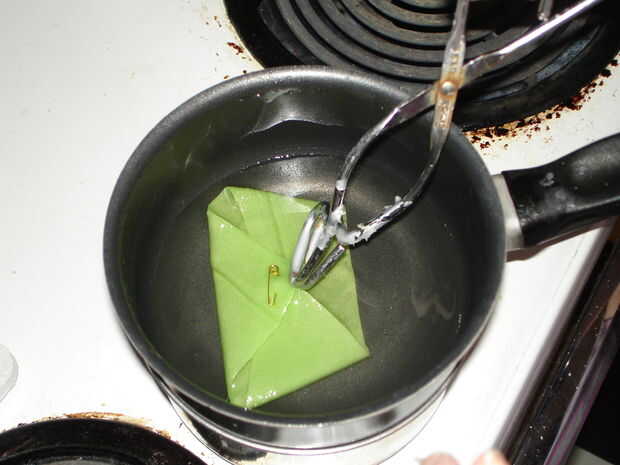 Ponga el pañal en la cera derretida. Usé las pinzas para recoger el pañal y dejar que la cera sobrante escurra. Entonces me deslicé con cuidado mis dedos dentro para hacer el pañal en forma de Copa de tuerca. Luego lo puse en el papel de aluminio para enfriar. Usted puede remodelar según sea necesario mientras está enfriando. Incluso inclinó a éste contra un frasco de píldoras para asegurarse de que la parte de atrás del pañal me alojé plana. (esto era algo que nunca he hecho antes de que parecía funcionar bien)