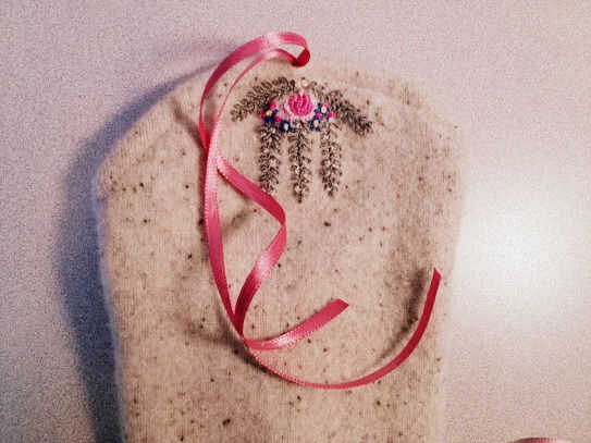 Después forro mi legwarmers, cosida 1/2" hacia abajo desde la parte superior, todo el camino alrededor, para hacer una cubierta. Usé una aguja embotada muy grande de cinta de hilo color rosa a través de la carcasa. La cinta me permitirá apretar el legwarmers, de modo que no vaya por debajo de mi rodilla cuando usarlos.