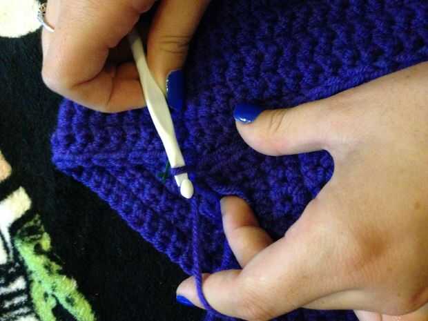 En el extremo de la "J" atar, cortar y tejer en los extremos.