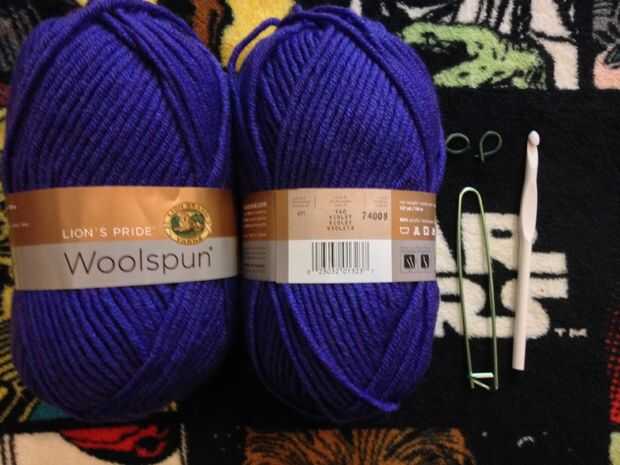 2 skiens Woolspun de orgullo de León (o hilado similar cat 5, aproximadamente 209 yardas) K - 10.5 crochet gancho H - 8 del ganchillo gancho (utilizado para tejer en los extremos, más por comodidad que otra cosa). Marcadores de punto