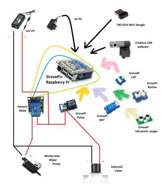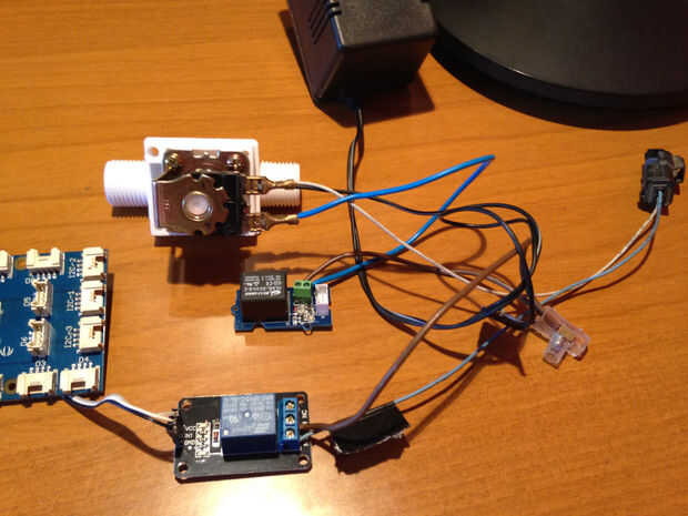 el otro cable del polo positivo de alimentación suministro está dividido en dos cables, primero en Relais de GrovePi, segundo en la entrada de COM del relé genéricos. Luego un cable de NO salida de relé genéricos al polo positivo de limpiaparabrisas bomba. Otro cable del relé de GrovePi al conector de la válvula de solenoide