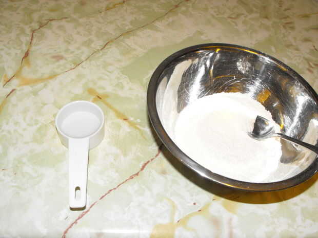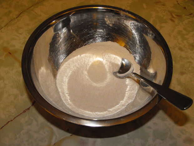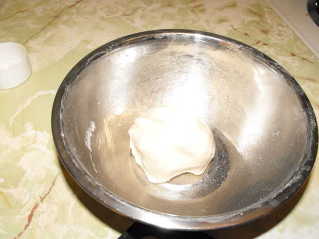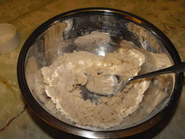 En el bol de tamaño mediano cernir juntos harina y la sal. Mix junto al ' mezcla de fluffing'the. No puedo realmente explicar, solo de la pelusa mientras revuelve. Añadir lentamente el agua agitando hasta parece desmenuzable. Amasar con las manos hasta que se forme una bola cohesiva de masa.