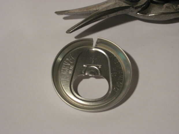Utilice las tijeras para cortar una muesca (unos pocos milímetros de ancho) en el borde de la lata superior.  Esto permite que la parte superior encajar en la botella.