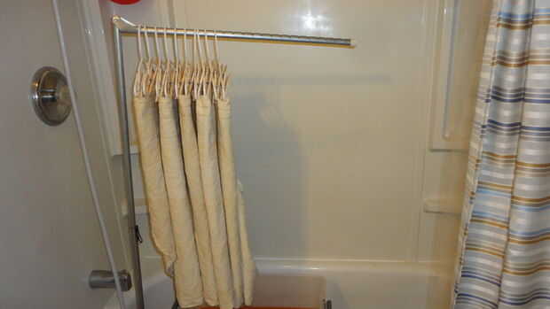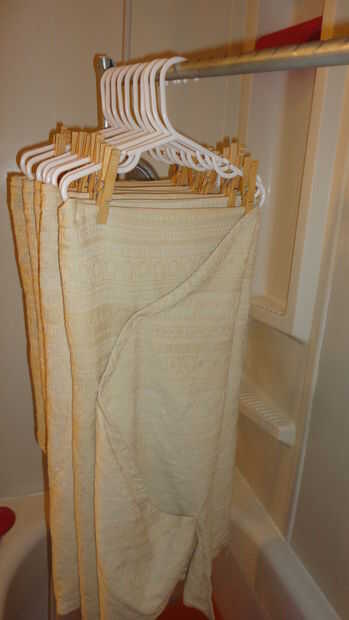 -Colgar el abrigo-Conecte ganchos a un carril de su envoltura el envoltura y atrás acordeón estilo plegable. Con esta envoltura sólo utilicé una capa por suspensión. Algunas personas conectar múltiples capas por suspensión, pero no quería que el tejido a palillo a sí mismo y desordenar mi teñido.