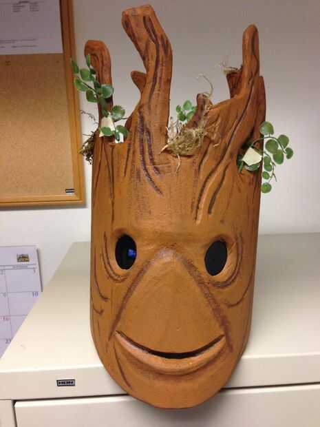 Los pasos finales para la máscara eran pegar en los detalles. Tomé un viejo par de gafas de sol de mi hija y la hizo estallar hacia fuera de las lentes. Rastrear los patrones de agujero en las lentes con un lápiz y utilizar una esmeriladora de banco (pero también funcionaría la Dremel) para las lentes de la forma. Fueron pegados en su lugar usando el mismo pegamento artesanal. He utilizado trocitos de la planta falso y una bolsa de musgo falso he comprado en el de Michael y pegado donde pensé que se veían bien en la máscara. Cuando todo lo seca, estaba muy contento con la máscara de Groot!