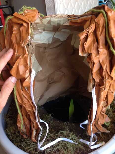 A continuación, tomó el papel de construcción y arrugada y había torcida lo largo. Tomé las secciones de papel torcido y utiliza clavijas de empuje para unir el papel al cuerpo de papel y aproximar la ubicación para que coincida con los cambios en el cuerpo del bebé Groot. Después de aproximadamente 4 pedazos de papel, recordé el papel de embalaje fina tenía de un parto reciente y decidió probar en su lugar, como el papel de construcción era muy grueso y rígido. Incluso rasgaron el papel de embalaje en fina (aprox. 9-12") tiras para minimizar cómo espesor proyectado fuera de la base del cuerpo. Era mucho más feliz con el embalaje de papel ya que sentí daba un aspecto mejor, era más ligero, más fresco y más fácil trabajar con.