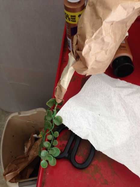 Los brazos eran el siguiente reto. Mi primer pensamiento era usar un tubo sólido y trenzadas tiras a éste (como el cuerpo), pero llegó a estar rápidamente claro que no hay movilidad y se rompe con facilidad. He intentado poner cortes de alivio en los codos y otros puntos de movimiento, pero todavía era propenso a desgarro. Mi idea final que usé fue tomar una longitud única, ancho de papel de embalaje y puesta en el hombro (dejando un montón de papel por encima del hombro) y envuelva el papel alrededor del brazo como funcionó abajo hacia la mano. Empecé envolviendo desde la parte superior de la debe hacia la parte posterior del brazo y luego bajo hacia la axila y alrededor del codo hacia abajo más allá de la muñeca y la mano. Este modelo permite buena movilidad en el hombro, codo y muñeca y no tuvo el problema de lagrimeo. Como el papel fue más allá de la mano de la forma cónica del material. Envolvió el papel así que había una abertura en la muñeca en la parte inferior para que sus manos podrían utilizarse, pero no eran fácilmente visibles. Después de que el papel de afilado, terminó en un pequeño trozo de la planta falso. Se utilizó cinta adhesiva para mantener la forma de los brazos en la posición envuelta, especialmente en el área de la mano. Se utilizó pegamento caliente para fijar la planta al final de los brazos. Cuando estaba satisfecho con los brazos, me resbaló el pedazo de chaleco del cuerpo sobre los brazos y luego utiliza cinta adhesiva para sujetar los brazos al chaleco del cuerpo en el interior. Varios cortes de relieve fueron hechos en las partes no visibles de la zona del hombro de las piezas del brazo para ayudar a fijar para el chaleco del cuerpo.