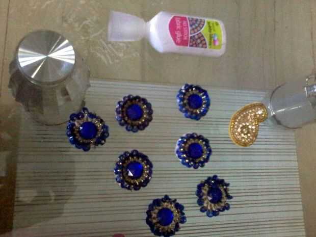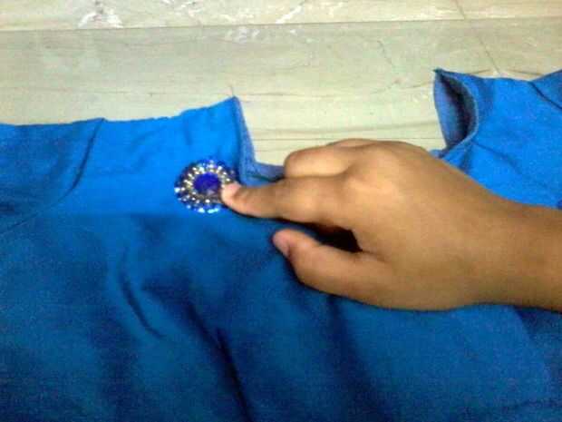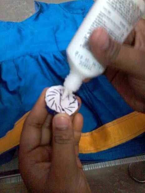 Aplicar el pegamento en la parte posterior de la piedra y presiona en el lugar deseado. (o puede utilizar hilo y aguja para coser las piedras de la tela)