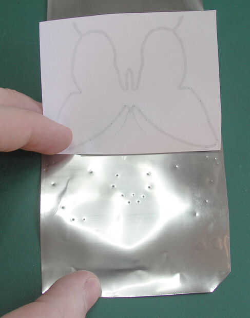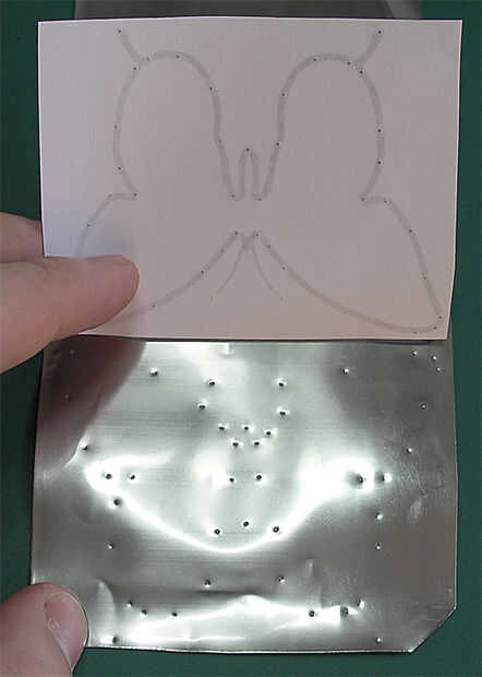 Usando una de sus herramientas de punta y siguiendo el patrón, empuje hacia abajo para crear pequeñas abolladuras en el matel a todo lo largo. No presionar tan fuerte como para hacer el agujero. It'snot al final de la obra si lo haces sin embargo.