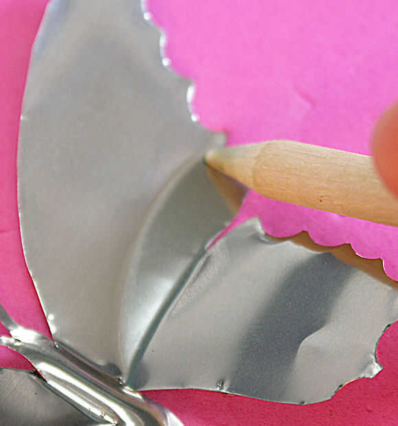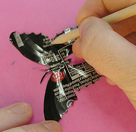 La vuelta la mariposa encima y usando la grasa de un lápiz o una herramienta similar forma, empuja hacia abajo a lo largo de la longitud de la sección de cuerpo e imprime en relieve hacia fuera. Cuando gira sobre el cuerpo debe tener una forma agradable a lo largo de su longitud.