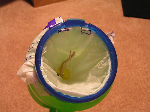Centro el plástico sobre la abertura de la taza. Introduzca el plástico en la taza que casi la mitad camino y cuidadosamente atornillar el "anillo de fijación" creado de la tapa de la taza. Quieres tener lo suficiente de la bolsa de plástico para flex dentro y fuera de la taza. Mira la foto retroiluminada en este paso para ver cómo se ve el cañón de aire en reposo para hacerse una idea de hasta qué punto en la taza que el plástico debe ser. (En el paso siguiente hay una foto que muestre cuánto fuera el plástico llegará.)