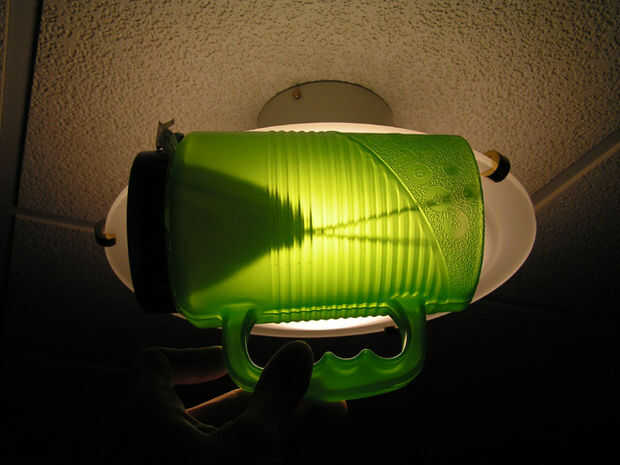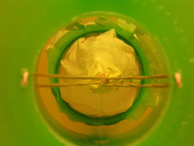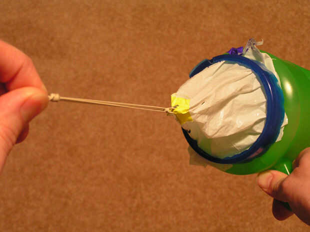 A continuación, cortar dos ranuras al lado de la Plaza de cinta del conducto en el diafragma de la bolsa de plástico para permitir que las gomas de la parte delantera al pasar a través de la bolsa y haz atado a "mango" en la parte posterior. En mi caso, desde que era barato y con prisa, "mango" es otra, más gruesa banda de caucho. La idea es pellizcar la bolsa entre las bandas de goma y el mango por pasar las gomas delanteras a través de las dos ranuras y atar su banda de "manejar" alrededor de las gomas delanteras y el centro del diafragma plástico reforzado.