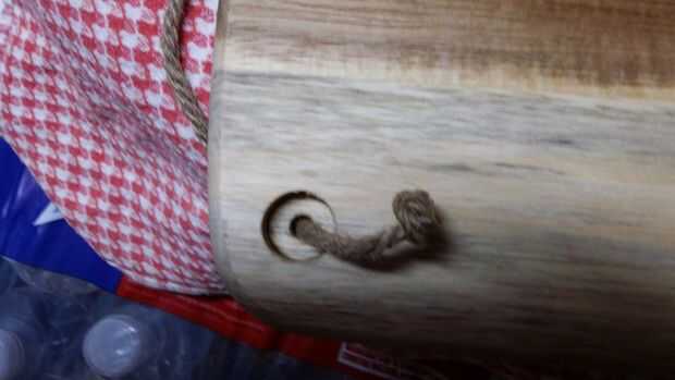 Luego cortar cuerda y había alimentado a través de los agujeros nuevos. (Hice dos agujeros de cada lado de la tabla de cortar). Luego ató un nudo en cada extremo de la cuerda haciendo que el nudo era sólo lo suficientemente grande como para permanecer dentro de ese agujero que había cortado.