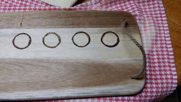 Originalmente iba a cortar arboledas para vasos de chupito para sentarse en, entonces había decidido contra él y localizar la parte inferior de las gafas en el tablero en su lugar. Estaba pensando que si fueras uno tener demasiados tiros que usted podría fácilmente derrame su bebida tratando de poner en el tablero. De esta manera también si papá decide cortar el queso en él por el contrario, también puede hacerlo. :)