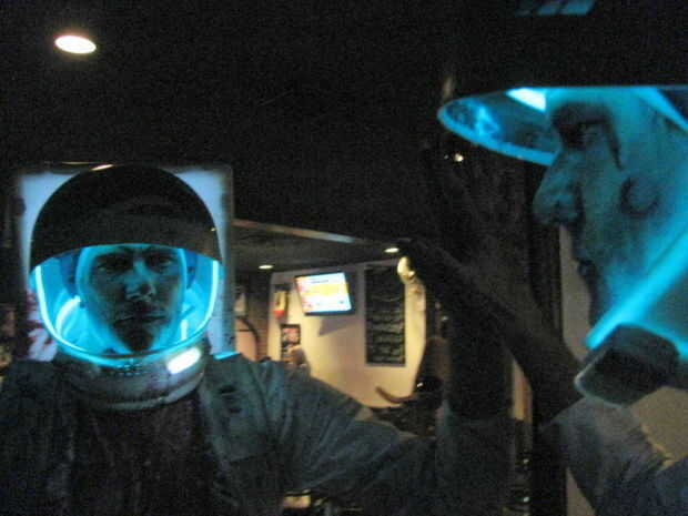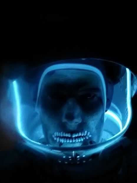 La luz azul en el interior del casco es E.L. (hilo electroluminiscente) que había comprado de meses amazon hace un proyecto diferente. Me imagino que en algún lugar cuesta entre 20 y 30 para la sección de 6 pies con el conductor que lo alimenta. El cable funcionó a través del casco, y abajo mi espalda dentro del traje, mantiene las baterías en el bolsillo de los pantalones dentro del traje. Este efecto fue muy dramática en lugares oscuros pero dificultaba ver fuera del casco si el visor se bajaba. Por esta razón simplemente cambié lo si deseo cerrar la pantallita.
