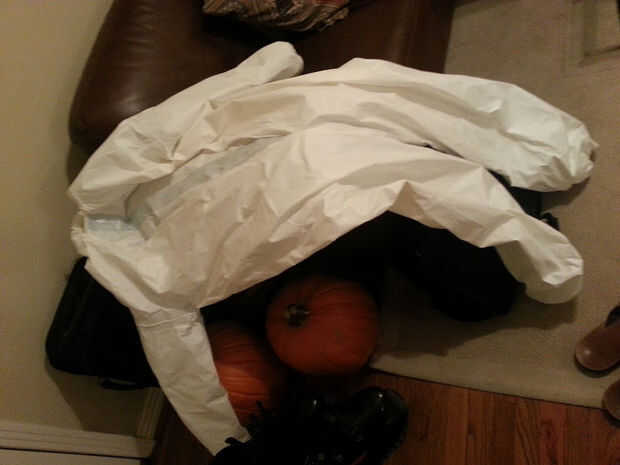 El traje de astronauta, es un traje de tyvek de The home depot $8, estos trajes son bastante baratos así que probar y comprar el más durable que tienen. Una vez usted lo consigue casero, cinta adhesiva todas las costuras (en el interior del traje) con cinta adhesiva blanca. Estos trajes son aproximadamente tan resistentes como papel y tienen una tendencia a convertir a lo largo de las costuras. Yo con esta cinta y no tuvo problemas.