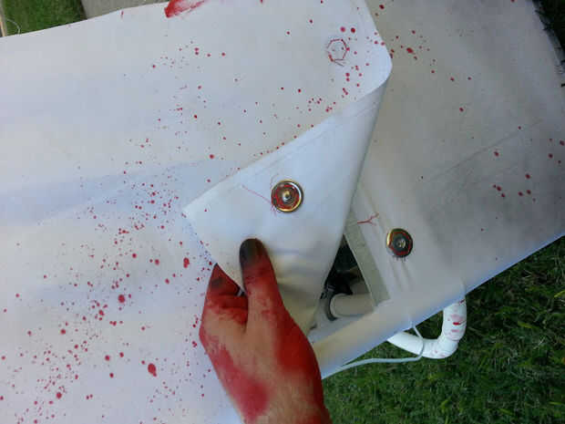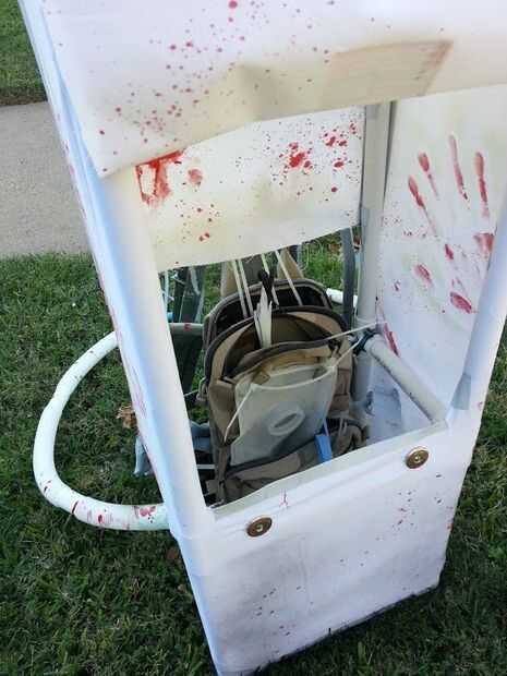 Después de un viaje a Joanne telas envuelve el marco de PVC con tela. Al principio he cosido el material en pero pronto recurrieron para rociar pegamento porque la costura es duro-a. La aleta de la espalda se mantiene pulsado con dos broches buttton que compré en la tienda de la tela. Tal vez costo total $20 para la tela y botones. En el interior de la mochila, os adjunto una luz de empuje. Esto ilumina el paquete desde el interior y le dio un muy fresco/extraño brillo en la mirada oscura.