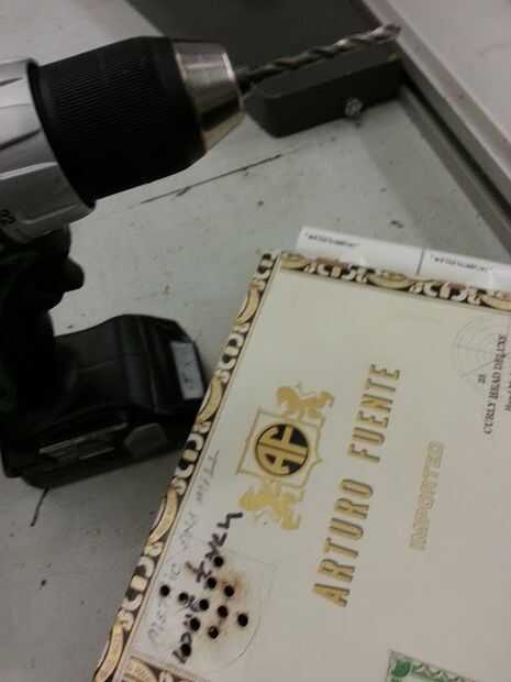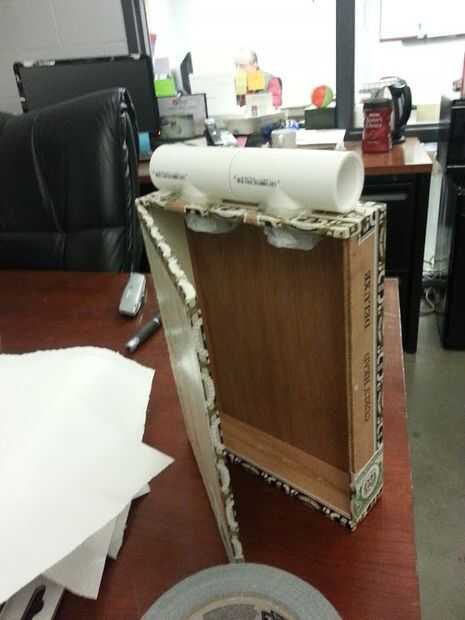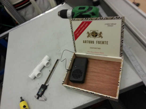 Los tubos de aire se hacen de la tubería más barata que pude encontrar en el hogar depot que os adjunto trozos de PVC a los extremos de ellos para evitar que la boquilla de la parte posteriora camello de llegar hacia atrás dentro de la tubería. El PVC extremos de las mangueras pero perfectamente en el PVC en la caja de cigarro. Esto le permite sacar el tubo de la caja en su parte delantera (el mismo que alberga al altavoz) y toma un sorbo de su bebida sabrosa de elección fácilmente.