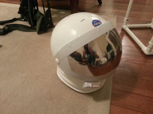 El casco que he comprado de amazon por $24. Spray pintado de blanco y luego utiliza tinte auto reflexivo sobre la visera de plástico para crear la mirada reflexiva de los cascos de Apolo. Me pareció necesario cortar el teñido en tiras antes de aplicar debido a la curvatura de la pantalla. De lo contrario terminas con burbujas. Me tomó cerca de 2 horas para crear el casco debido a esto pero la mirada de él es grande y se puede ver a través de la pantalla perfectamente.