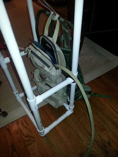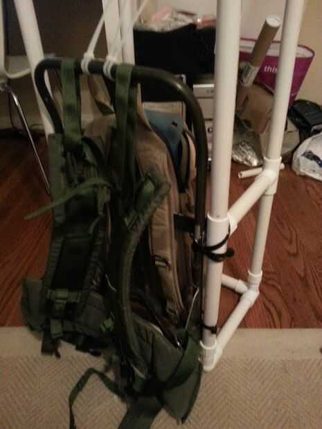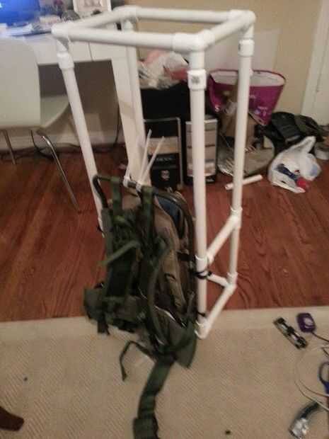 La mochila está hecha de carga militar mochila marco (US $9 en amazon más gastos de envío) y tubería de PVC. Me ziptied el PVC caja que hice para la mochila ALICE. Luego até 2 paquetes de camel (gratis porque les tenía ahí) en el interior de la caja con más zipties. Es importante tener los paquetes de camel apretado si usted tiene la intención de saltar.