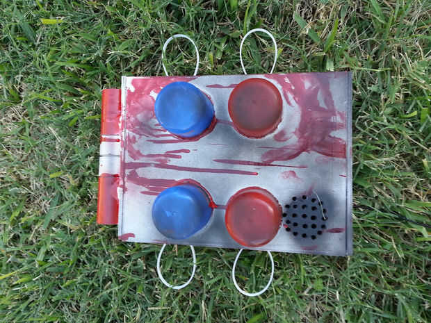 La caja en mi pecho se hace de una vieja caja de cigarro que obtuve del maquinista en la escuela. La caja negra en su interior es un altavoz con un micrófono que me topé con el casco. Encontré esto por $12 en la ciudad de fiesta y el altavoz de chisporroteo había amplificado mi voz. Yo estaba impresionado con lo fácil que era este paso y cuánto sonaba como una transmisión de radio. Los botones rojos y azules son las tapas para latas de silly string en que pegué con pegamento caliente. La luz en el medio es un ligero empuje de The home depot. El montaje en la parte superior de la caja de PVC se aferra a las mangueras de aire que tirón para dispensar bebidas.