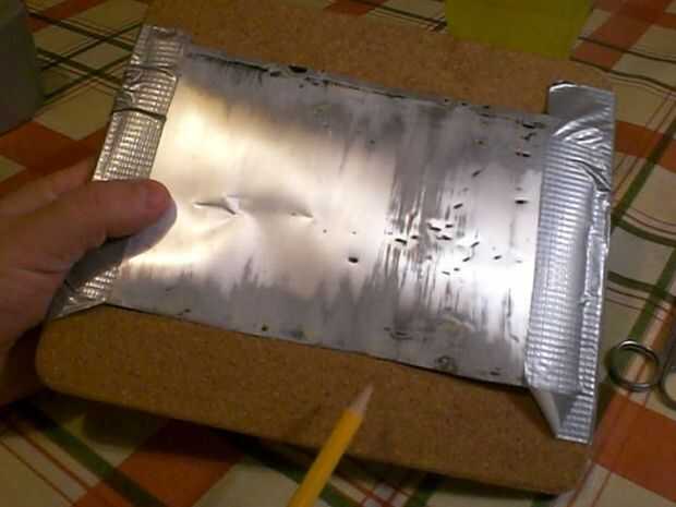 Cinta de metal abajo de plano a una superficie rígida que tiene un poco de rendimiento.  Esto podría ser un pedazo de cartón fuerte, pero he utilizado el corcho detrás de una estera de tabla de cena.
