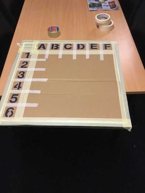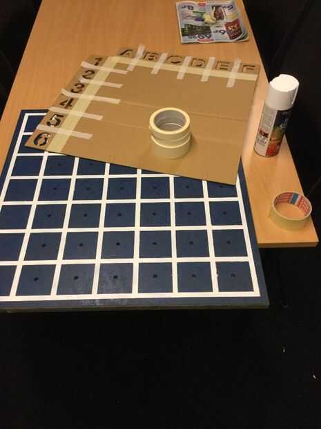 En principio esperaba encontrar pegatinas con las letras y los números que necesitaba para Battleshots. Sin embargo no he podido encontrar ninguno en el tamaño correcto. Así que acabé de cortar una plantilla en un trozo de cartón y una vez más utilizar la pintura en aerosol blanco.