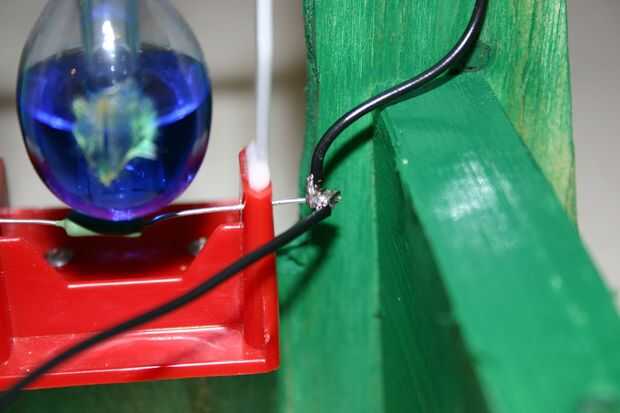 Conectar otro cable a la derecha del pájaro #1.  Este cable se extenderá detrás del árbol alrededor de 15 pulgadas.