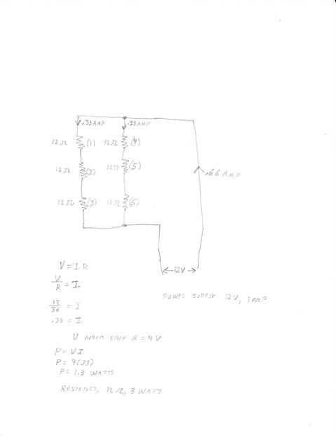 Esquema se muestra a continuación, cada resistor de 3 vatios está sujeta a unos 1,5 vatios de energía en esta configuración.