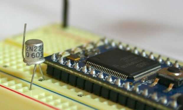 Colocar un transistor en la protoboard junto a la patilla número 21. La pierna al lado de la pestaña entra en un agujero al lado de la línea azul (segundo agujero de la derecha).