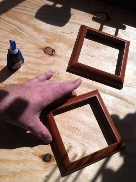 Ponen su cuarto redondo piezas en grupos de cuatro. Empujar juntos como un marco de imagen, si hicieron un trabajo preciso en el ultimo paso todo debe alinearse muy limpio sin espacios en las articulaciones. Tomar un poco de "loco" cola rápida (cianoacrilato para los nerds) y aplicar a cada extremo de cada pieza. Usted no necesita mucho, sólo un poco, pero pone un poco en cada extremo para asegurarse de que usted está recibiendo una buena adherencia. Si todas las piezas y los cortes son rectos sólo podrá hacer todo esto juntos haciendo un diamante con la mano y presionando igualmente en todos los lados de la Plaza. Sólo necesita mantener juntos por un minuto o dos mientras el pegamento fija. Después de dejar ir que sientan más otros 10 minutos más o menos seco, y tomar una cerveza.