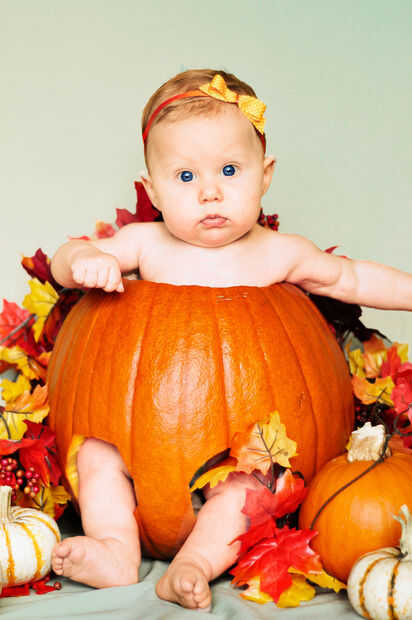 Después de limpiar el interior de una calabaza grande, corté 2 agujeros cerca del fondo. Había forrado el interior de la calabaza con papel de cocina por lo que sería acogedor y suave, y luego a mi bebé dentro. Realmente sentó proped bien dentro de la calabaza y me alojé durante un buen rato.