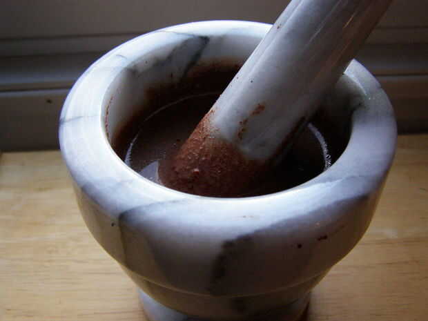 Tomé 2 cucharadas de la mezcla de tierra y lo pones de nuevo en mi mortero y Maja junto con 4 cucharadas de agua. (si haces toda la masa a la vez, sólo hacerlo en lotes, o todos a la vez si tiene una enooorme mortero y Maja. En todos, usted debe terminar con la mezcla de taza cacao ~1/2 entero y 1 taza de agua si haces toda la masa). Utilicé agua hirviendo, pero por el momento terminé molerlo fue tibia de todos modos, así que no estoy seguro es importante.