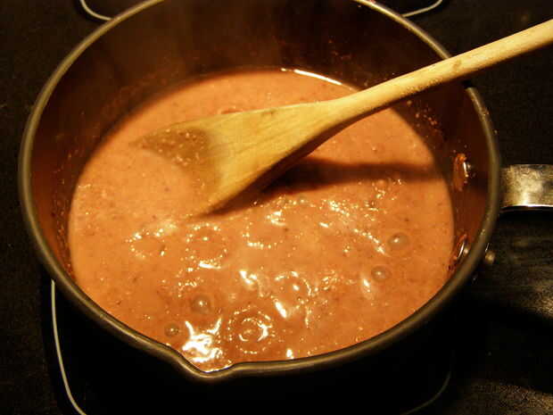 Lleva a ebullición, luego a fuego lento lo a fuego medio durante 15 minutos, revolviendo casi constantemente. En este punto, olía muy bonito, y pensé que tal vez, sólo tal vez, con bastante miel, sería aceptable.