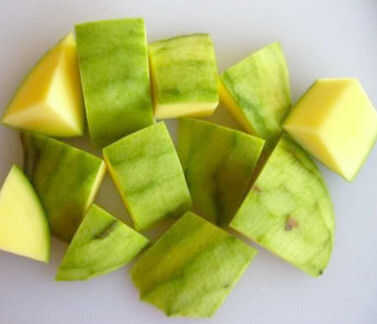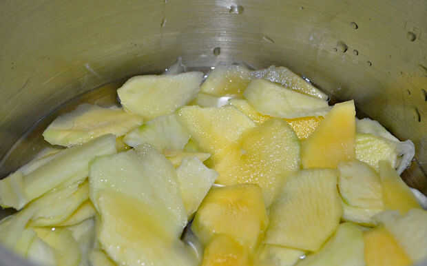 2-en un recipiente, agregar los pedazos de mango cortados y alrededor de 1 taza de agua, hervir durante 10 minutos.