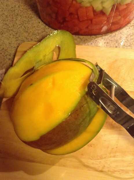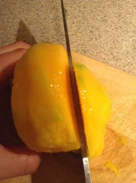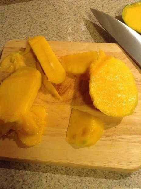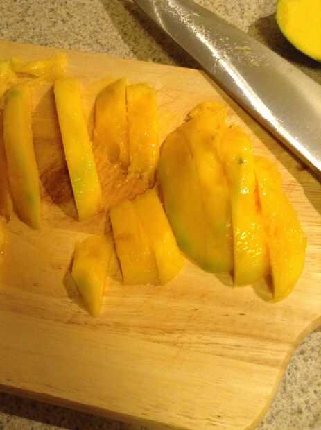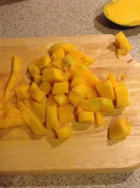 Pelar cuidadosamente la piel de mango utilizando un pelador de fruta. Trocear el mango como se muestra en las fotos. Para la presentación de propósitos sólo, intentan cortar el mango en pedazos incluso. Entonces, se coloca el mango en dados dentro de la jarra.